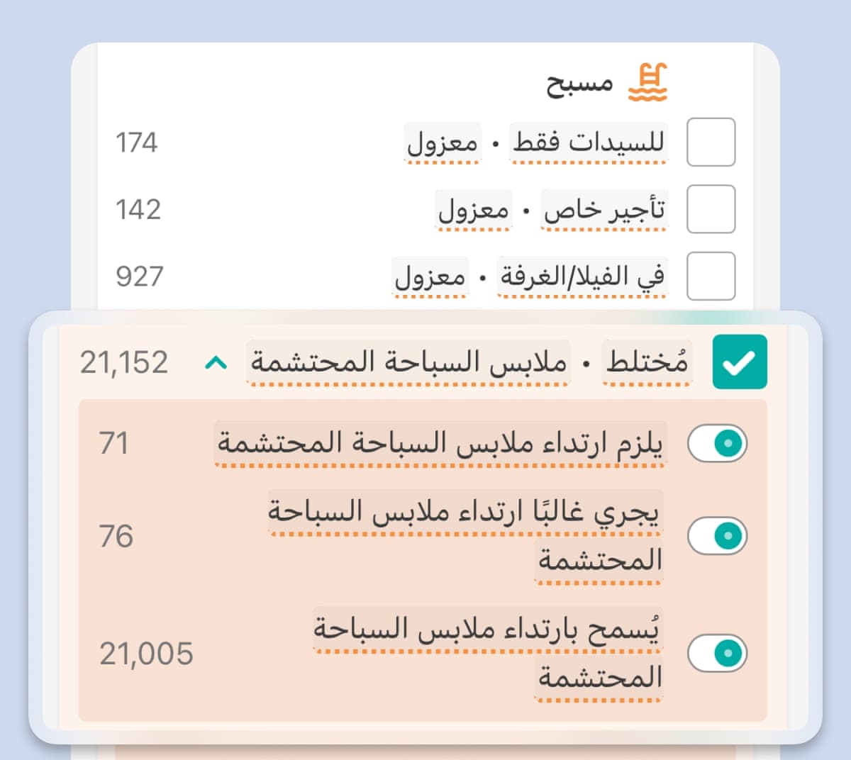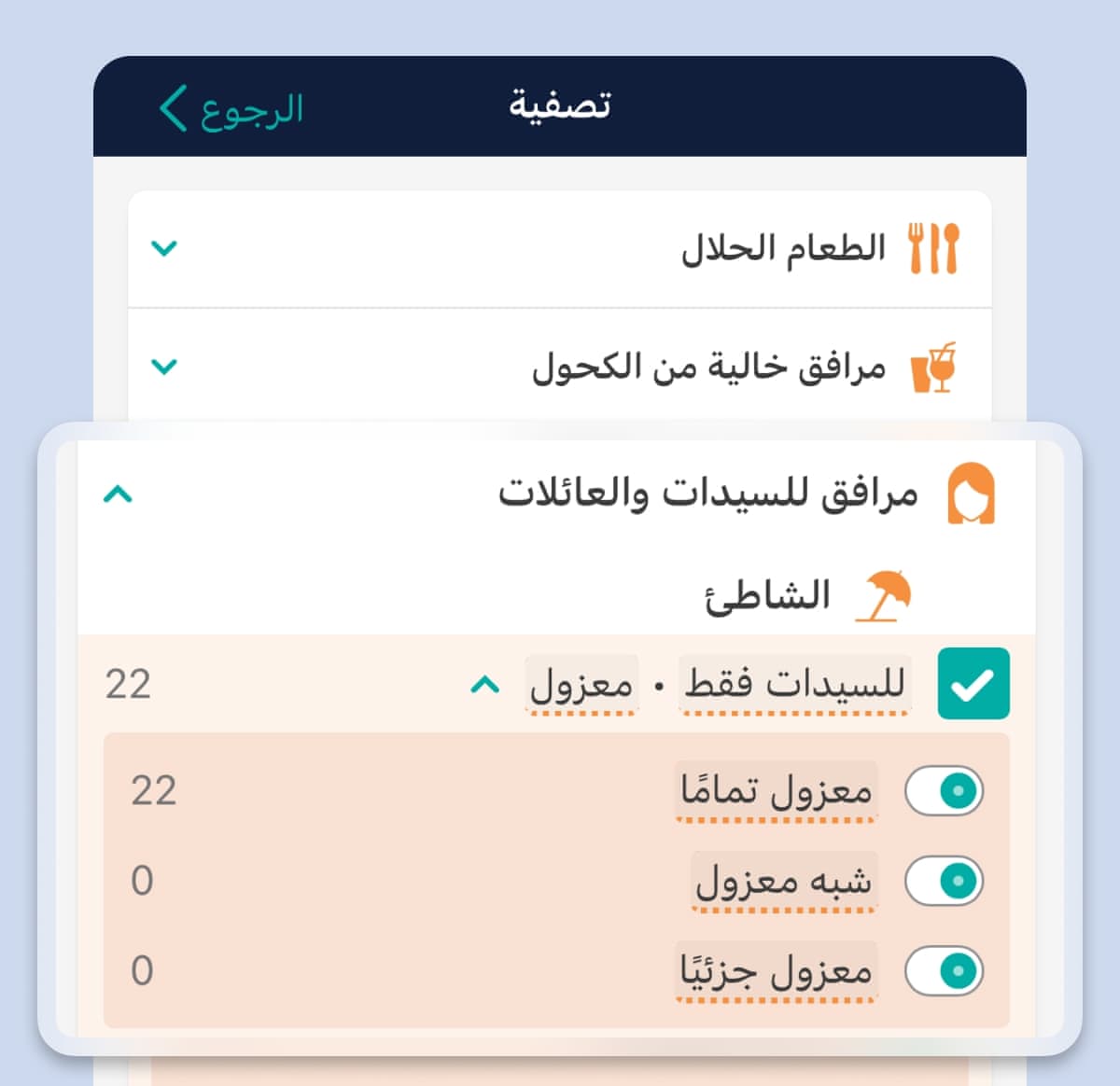 تسهل تصفيات "مرافق للسيدات والعائلات" المميزة لدينا العثور على فنادق توفر شاطئًا أو مسبحًا أو مركز سبا مخصصًا للسيدات، وتسمح بارتداء ملابس السباحة المحتشمة. ولا تقدم أي منصة سفر كبرى أخرى هذا المستوى من التفاصيل والشفافية.