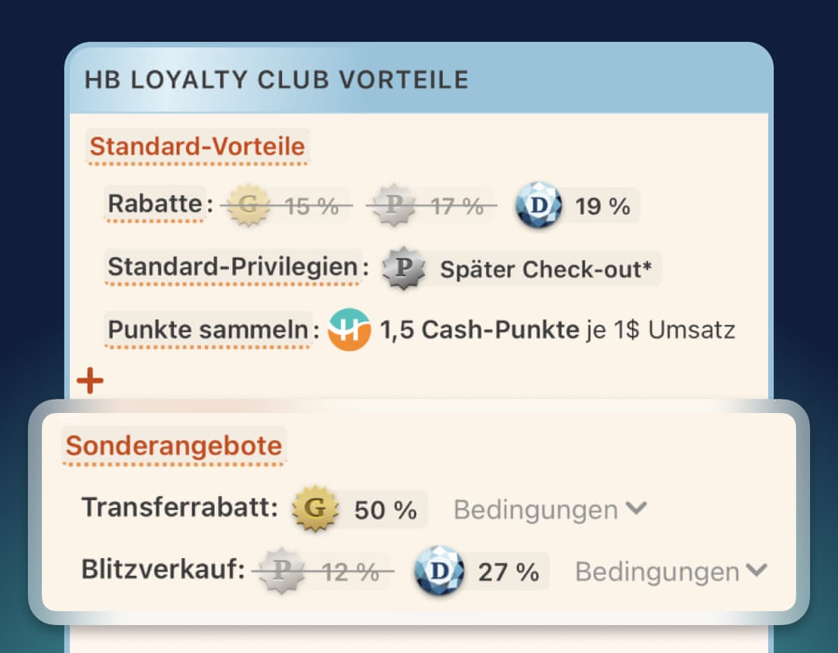 Wählen Sie ein Hotel aus, um die Details der Rabatte im Bereich HB Loyalty Club Vorteile auf der jeweiligen Hotelseite zu sehen.
