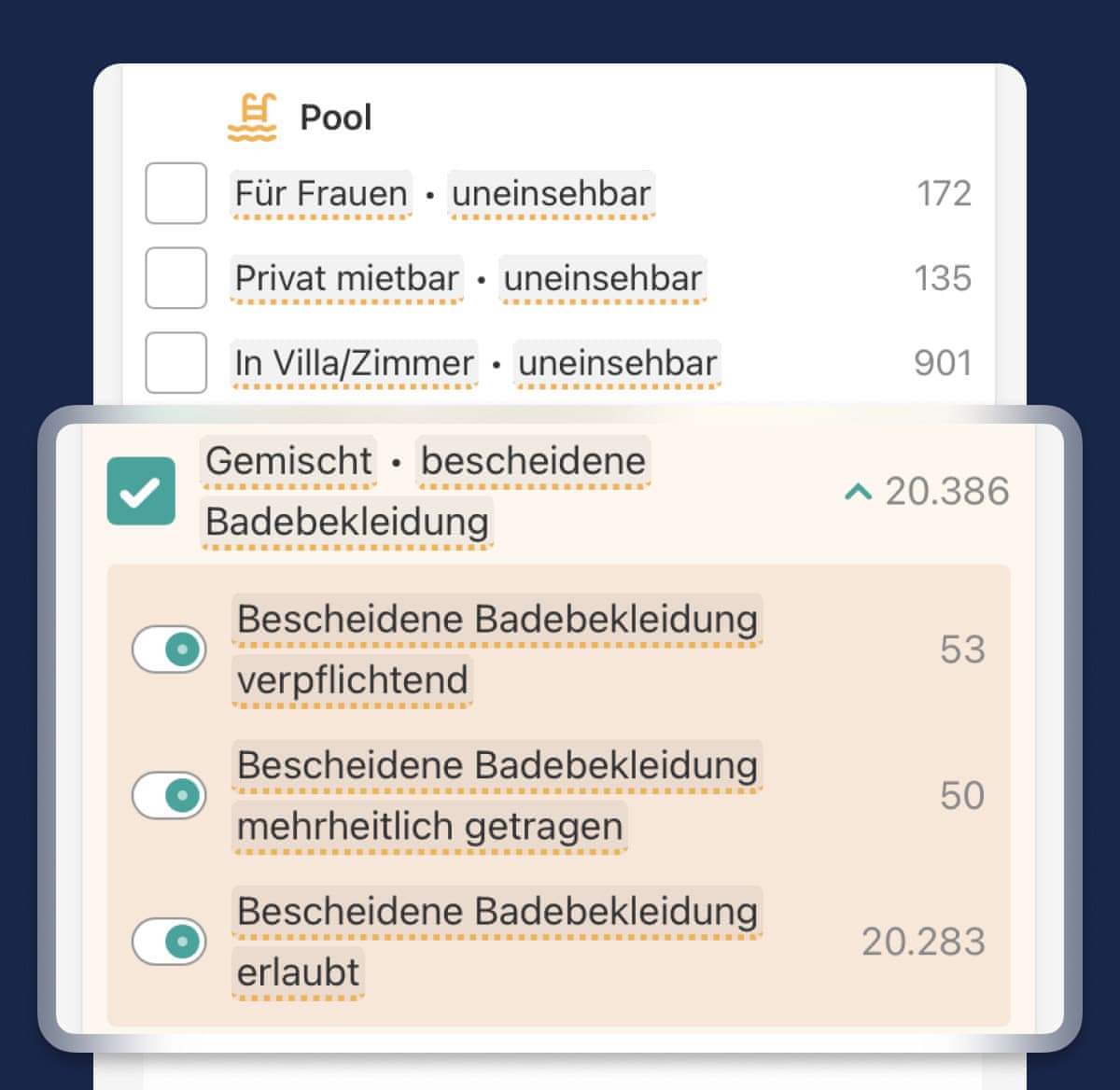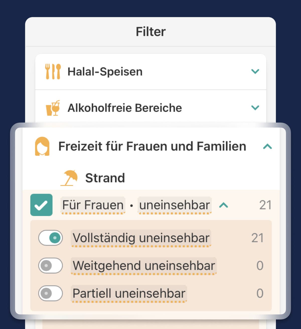 Familien. Niemand muss auf das Sonnenbaden oder den Badespaß im Meer oder Pool verzichten! Mit unseren einzigartigen Filtern "Freizeit für Frauen und Familien" finden Sie ganz einfach Hotels mit Strand, Pool oder Spa nur für Frauen, sowie solche, an denen das Tragen von bescheidener Badebekleidung erlaubt ist.