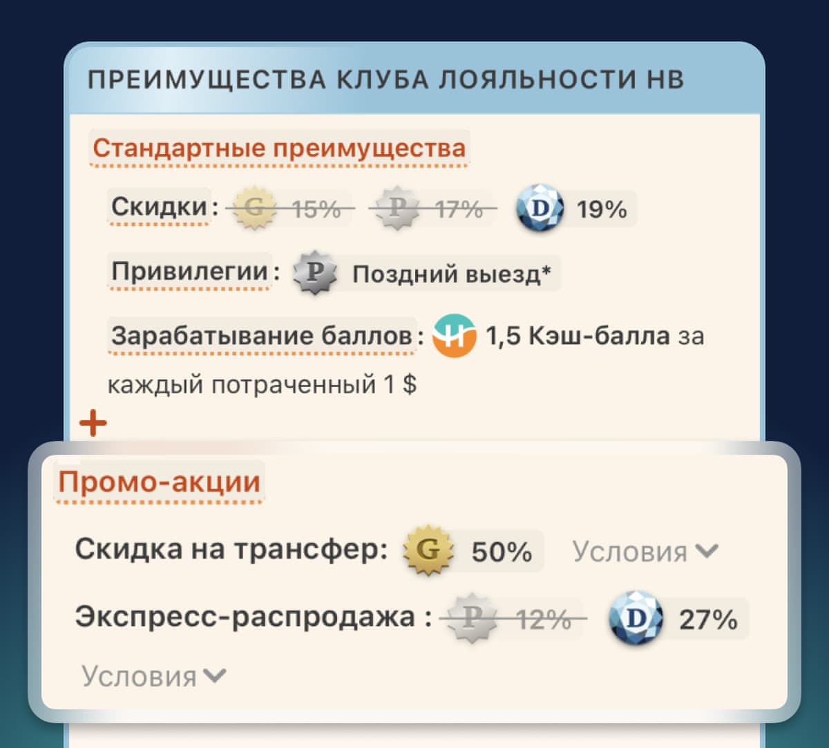 Выберите любой отель и зайдите на его страницу: вся информация о скидках указана в разделе "Преимущества клуба лояльности HB". Вы увидите там "Стандартные преимущества", доступные на постоянной основе, и "Промо-акции", которые зависят, например, от дат бронирования или длительности пребывания.