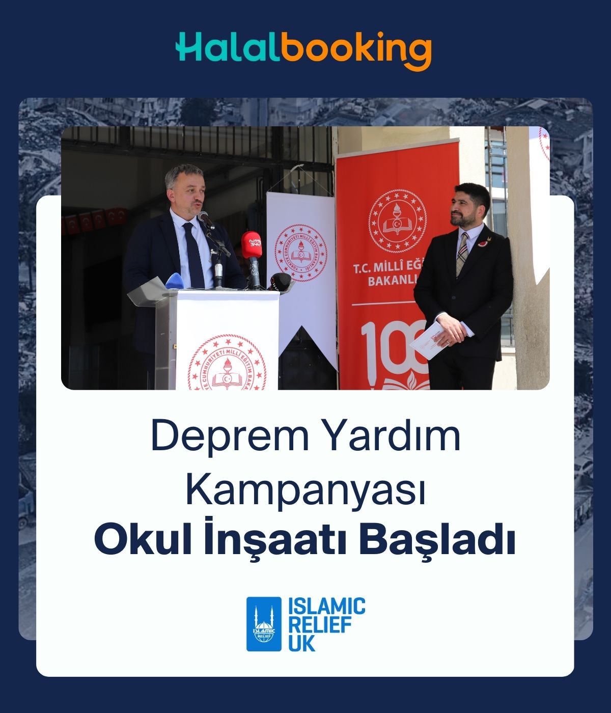 16 Mayıs 2025 tarihinde, Halalbooking'in 200.000 Euro tutarındaki deprem sonrası yeniden inşa kampanyasının merkezindeki kilit proje olan ilkokul binasının temellerinin atılması münasebetiyle Türkiye'nin Kahramanmaraş ilinde bir tören düzenlendi. Törene yerel yöneticiler ve Eylül ayında açılacak olan okulda eğitim görmeyi ümit eden 200 öğrenci katıldı.