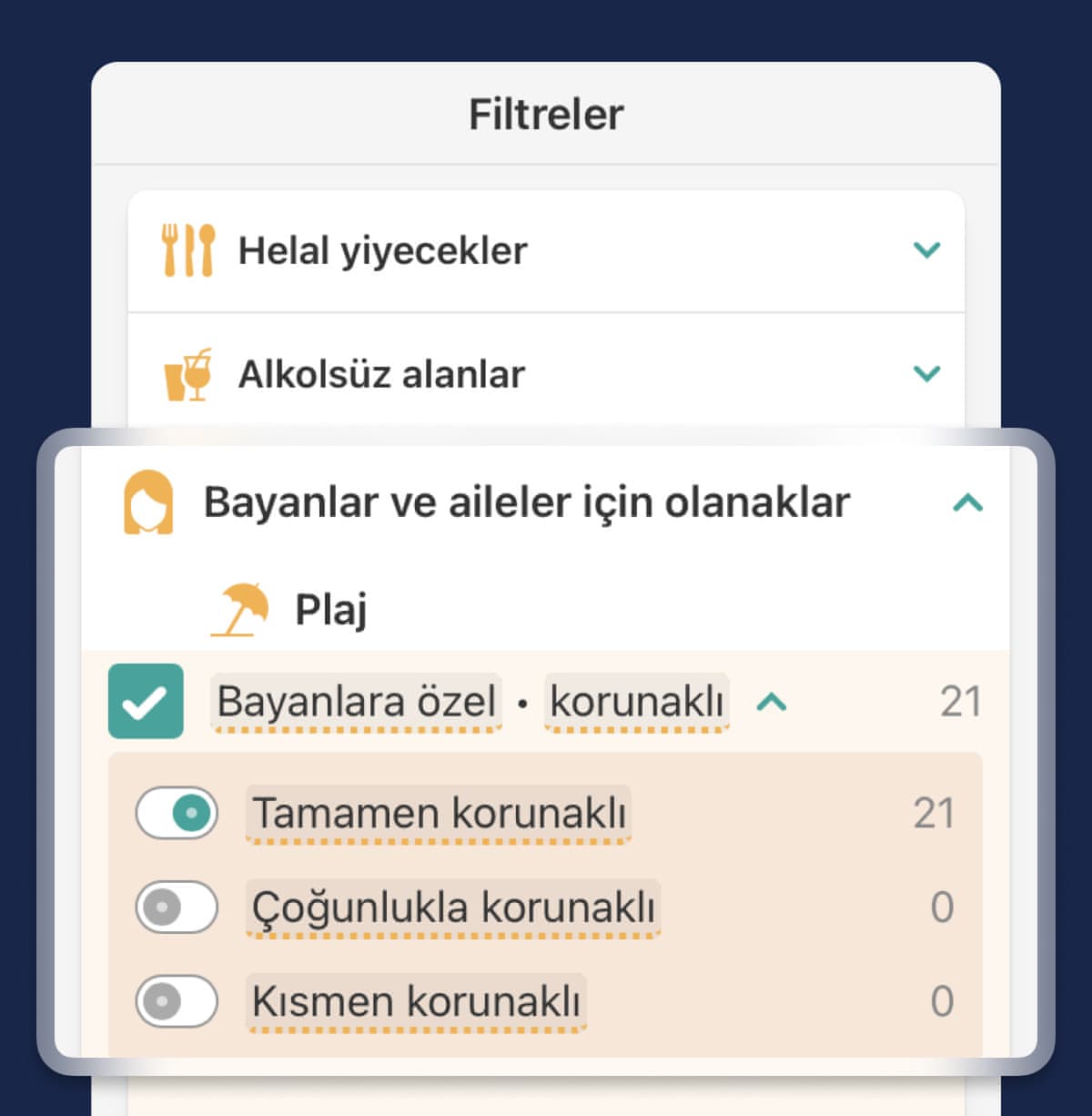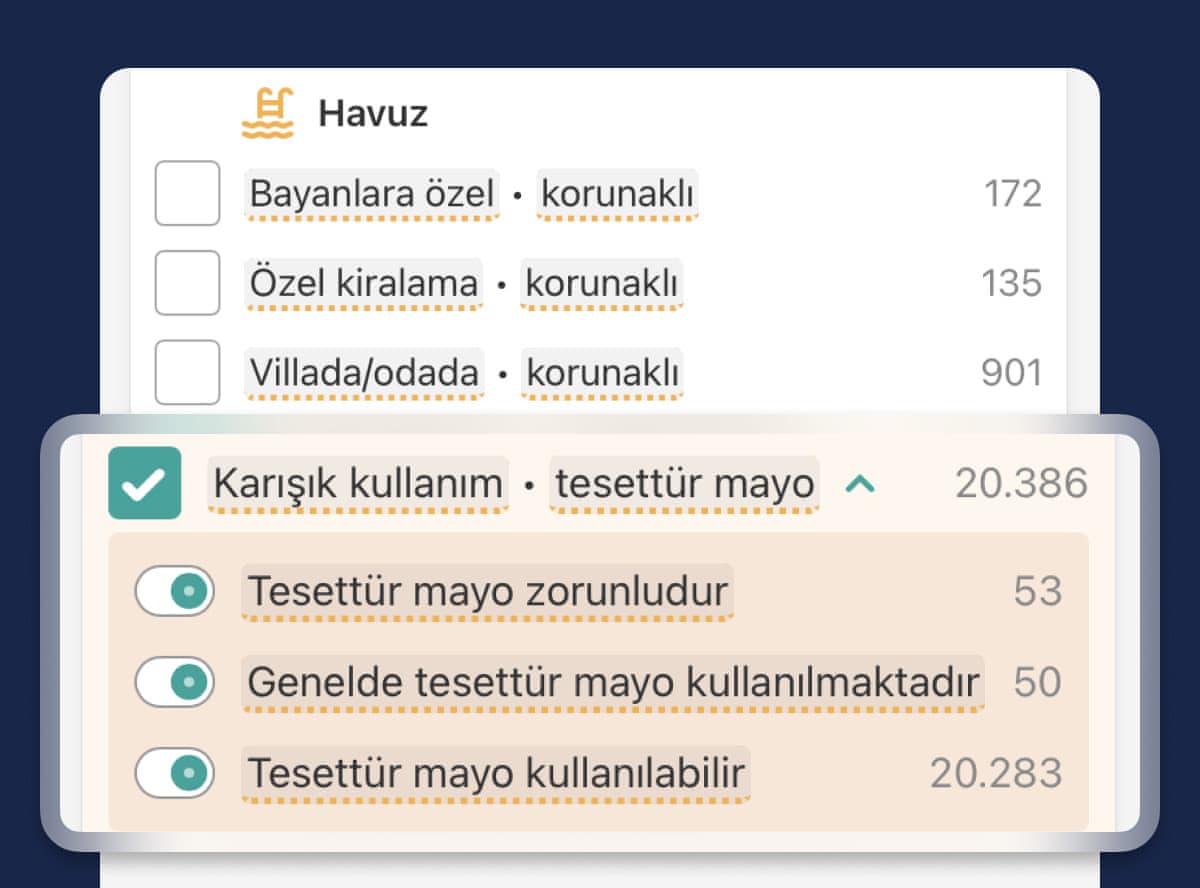 | | | Kadınlara özel havuzu, plajı veya spa merkezi olan bir oteli nasıl bulabilirim? | Önceliklerinize bağlı olarak 'plaj', 'havuz' ve/veya ' sağlık & spa' seçeneklerinden birini seçin ve Bayanlara özel • korunaklı filtresini işaretleyin. 'Tamamen korunaklı', dışarıdan kimsenin içeriyi göremeyeceği anlamına gelir. Sadece kadınlara özel alanlarda, gizliliğin tam olarak sağlanması için telefon kullanımının yasak olması yaygın bir uygulamadır.